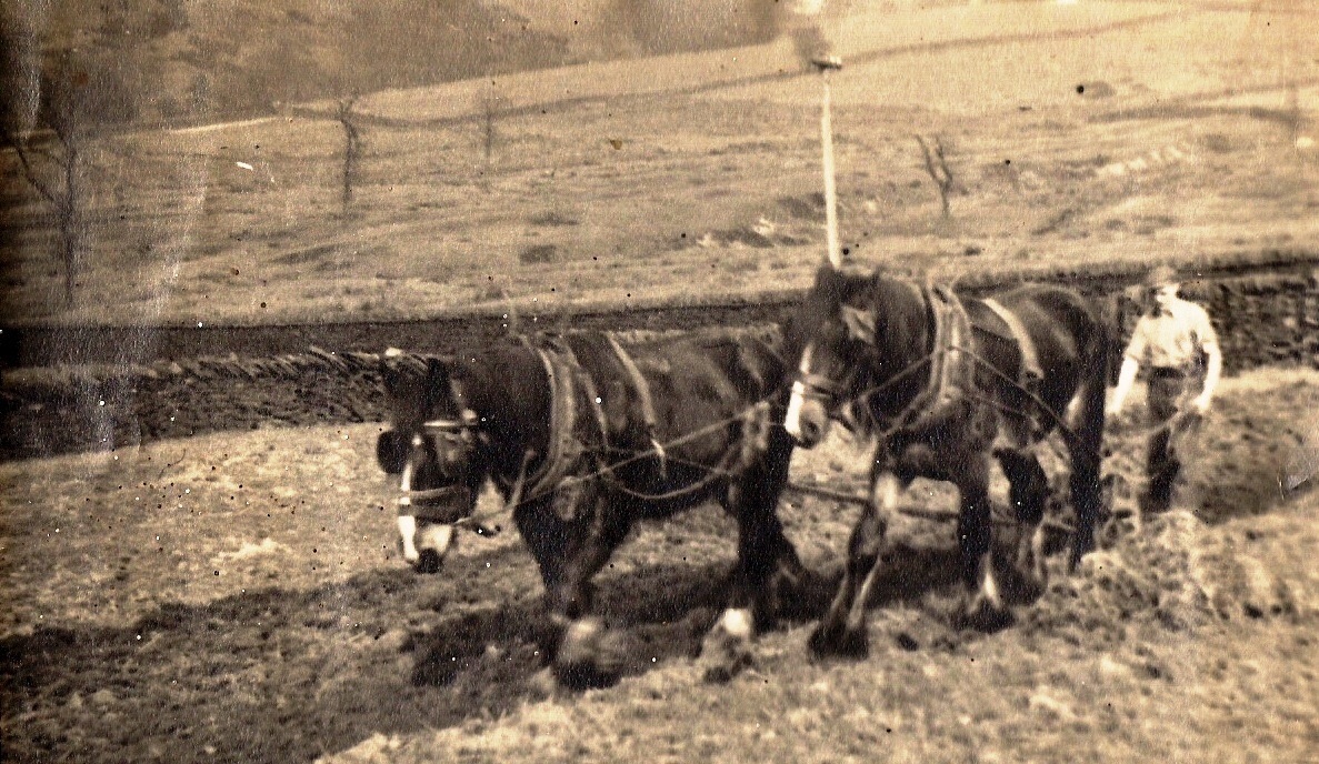 Fred is leading the young horse by the bridle, pulling a flat cart behind. A sheep jumps up on the bank of the narrow path and startles Paddy. Paddy shoots off, down the narrow lane, dragging the cart behind – and pulling Fred along with him. And for a couple of hundred yards, Fred never lets go.
